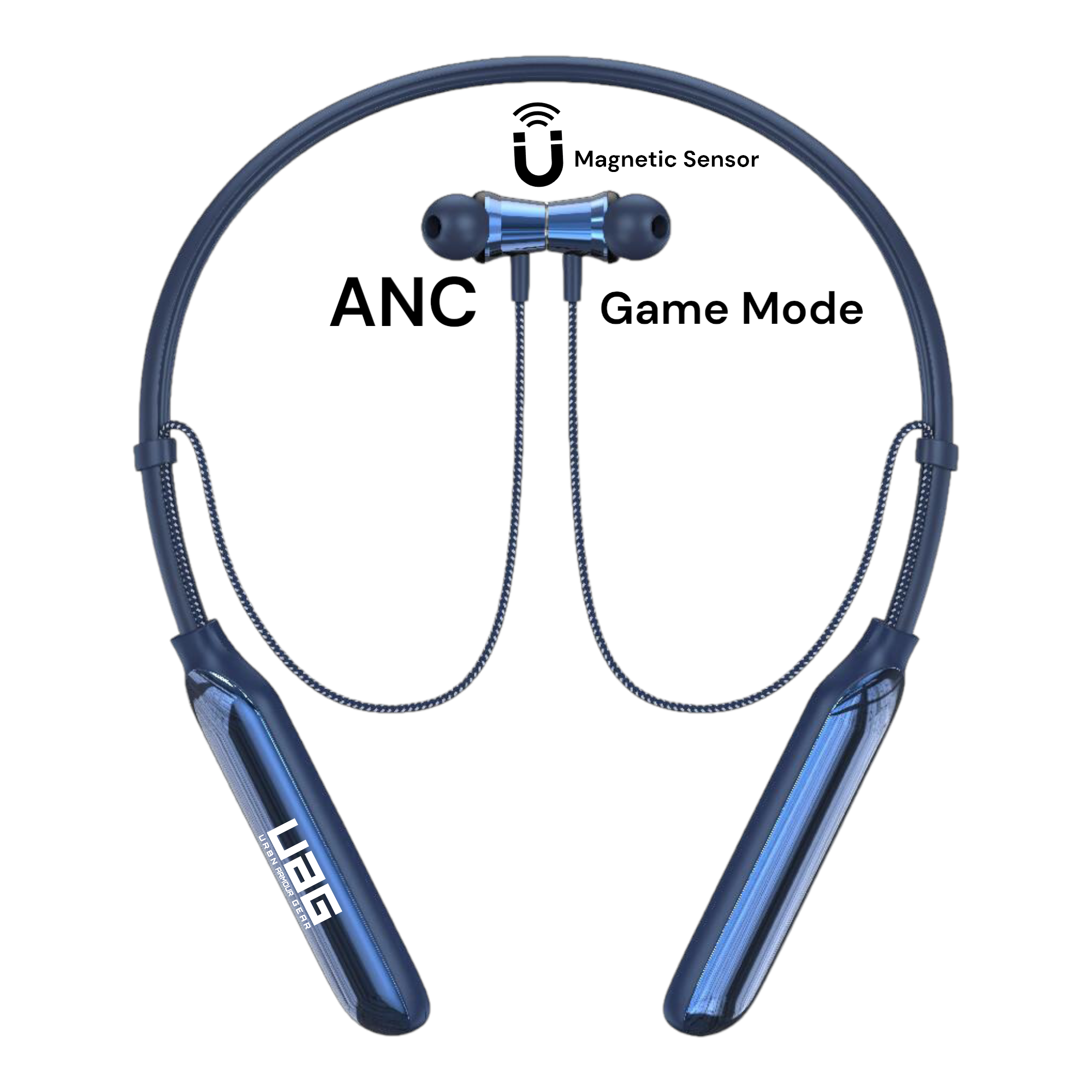 UAG Urbn Armour Gear Shine Matel ANC Gaming & Music Magnetic Sensor ON/OFF With Vibrate Feature orignal Luxury Ultimate Design with Uniqe shine nav blue colour neckband which is comes with Deep Bass sound ANC protect feature OR Anti Dust Water ipx64 proof with Red safety OR 50hour battery backup. Bluetooth Connectivity: The neckband would have Bluetooth technology built into it, allowing it to connect wirelessly to other Bluetooth-enabled devices such as smartphones, tablets, or computers. This would enable the user to listen to music, take phone calls, or use other audio features without being tethered by wires. Magnetic Sensor On-Off: The magnetic sensor on-off feature could serve multiple purposes: Power Control: The neckband could have a magnetic switch that turns the device on or off. When the two ends of the neckband come together (where the magnets are located), it triggers the sensor to turn the device on. Conversely, separating the ends would turn it off. This feature can make it easy to power the device on or off with a simple gesture. Call Answer/End: Additionally, the magnetic sensor could be used to answer or end phone calls. For example, bringing the two ends of the neckband together could answer an incoming call, while separating them could end the call. Convenience and User Experience: Incorporating a magnetic sensor on-off feature adds convenience and improves the user experience by providing a simple and intuitive way to control the device’s power and certain functions without the need for physical buttons or complex gestures. Such a Bluetooth neckband with a magnetic sensor on-off feature would offer users a wireless and hassle-free audio experience with added functionality for easy control and management