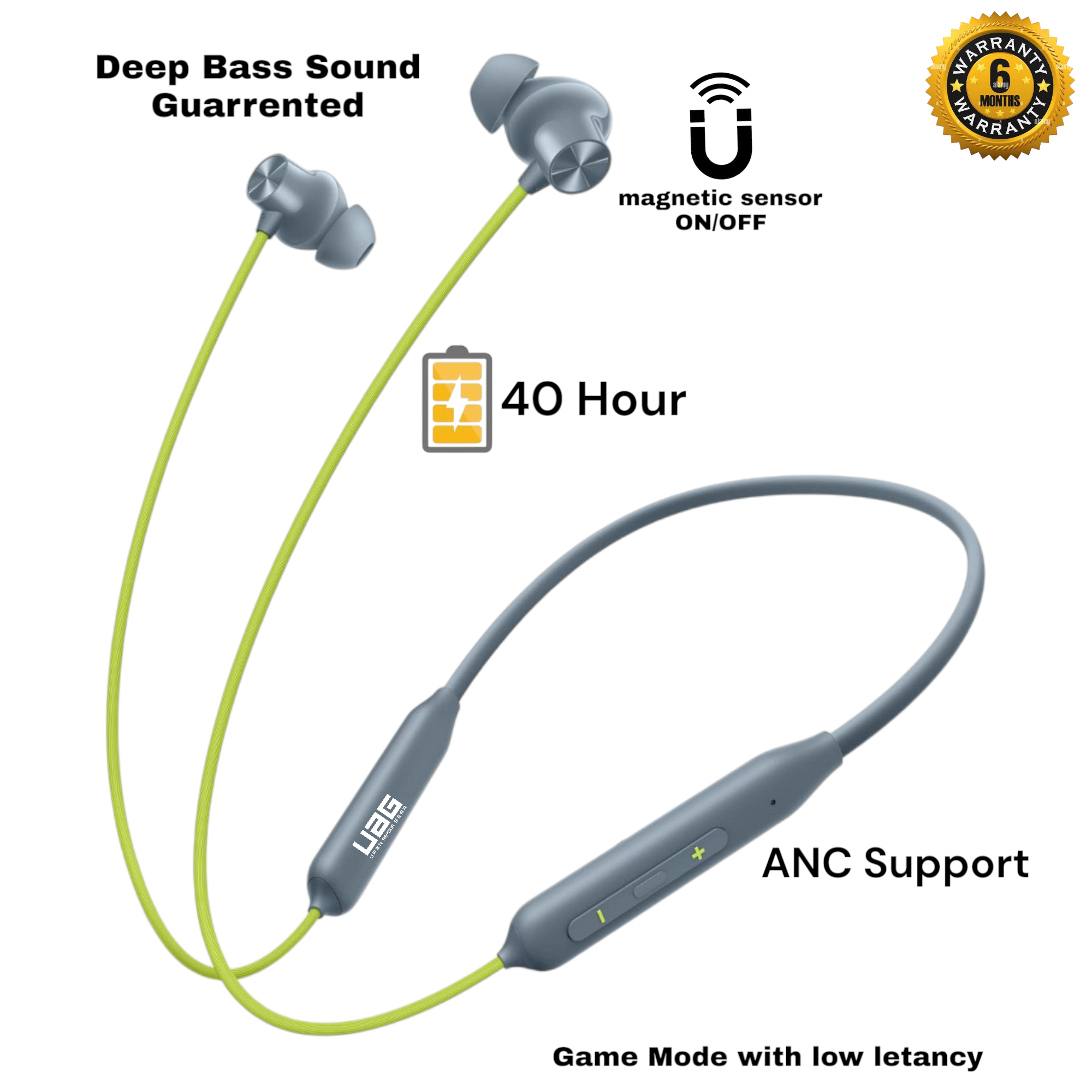 UAG Urbn Armour Gear Bullet z2 ANC Gaming & Music Magnetic Sensor ON/OFF Feature orignal Luxury Ultimate Design with Grey colour neckband which is comes with Deep Bass sound ANC protect feature OR Anti Dust Water ipx64 proof with Red safety OR 50hour battery backup. Bluetooth Connectivity: The neckband would have Bluetooth technology built into it, allowing it to connect wirelessly to other Bluetooth-enabled devices such as smartphones, tablets, or computers. This would enable the user to listen to music, take phone calls, or use other audio features without being tethered by wires. Magnetic Sensor On-Off: The magnetic sensor on-off feature could serve multiple purposes: Power Control: The neckband could have a magnetic switch that turns the device on or off. When the two ends of the neckband come together (where the magnets are located), it triggers the sensor to turn the device on. Conversely, separating the ends would turn it off. This feature can make it easy to power the device on or off with a simple gesture. Call Answer/End: Additionally, the magnetic sensor could be used to answer or end phone calls. For example, bringing the two ends of the neckband together could answer an incoming call, while separating them could end the call. Convenience and User Experience: Incorporating a magnetic sensor on-off feature adds convenience and improves the user experience by providing a simple and intuitive way to control the device’s power and certain functions without the need for physical buttons or complex gestures. Such a Bluetooth neckband with a magnetic sensor on-off feature would offer users a wireless and hassle-free audio experience with added functionality for easy control and management