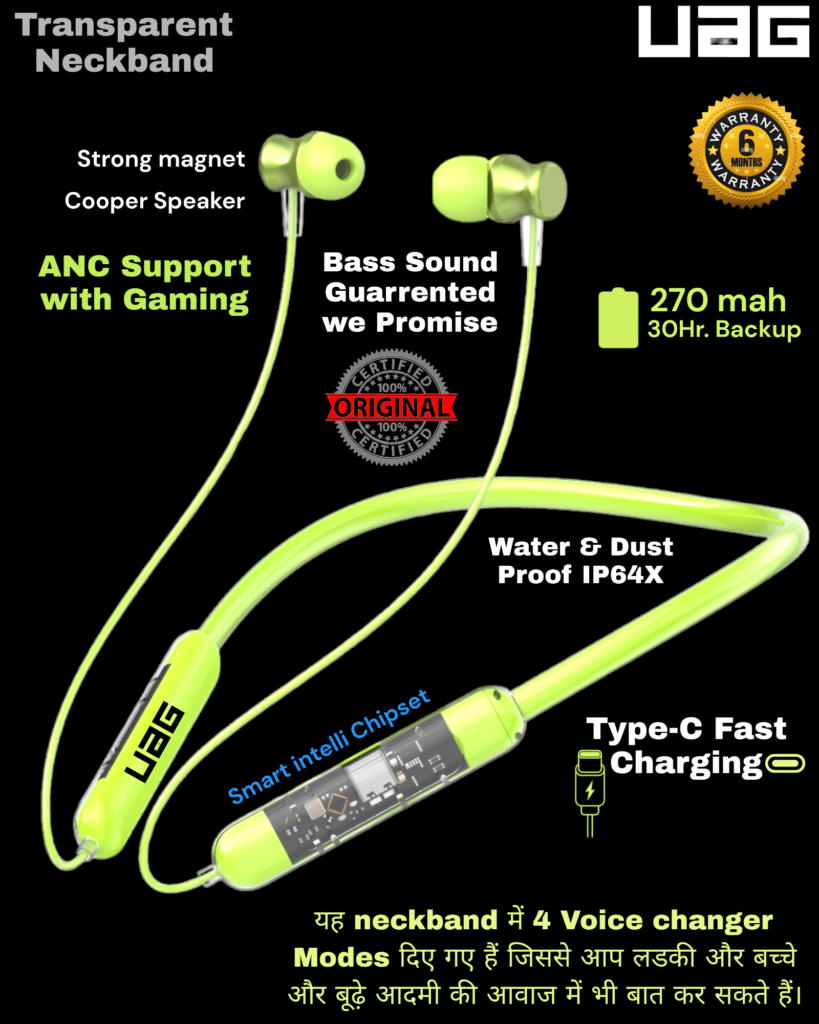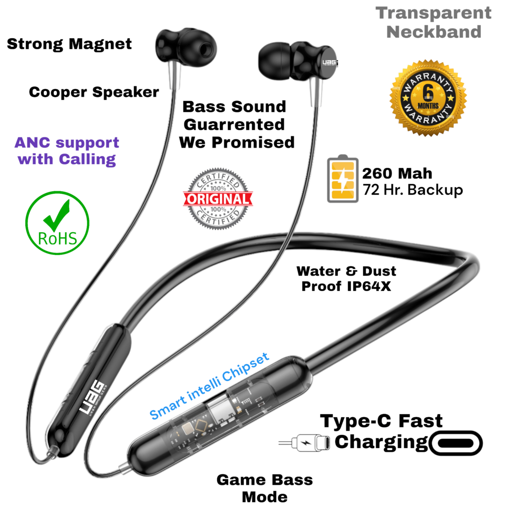 UAG Urbn Armour Gear Bullet z2 ANC Magnetic Sensor ON OFF Blutooth Neckband which comes with 50 hour Battery Backup and high Quality Design with Deep Bass sound with Gaming Chipset With cooper speaker and matel Ears or Type C fast charge or Vibration on calls and notifications Feature and Water or Dust proof