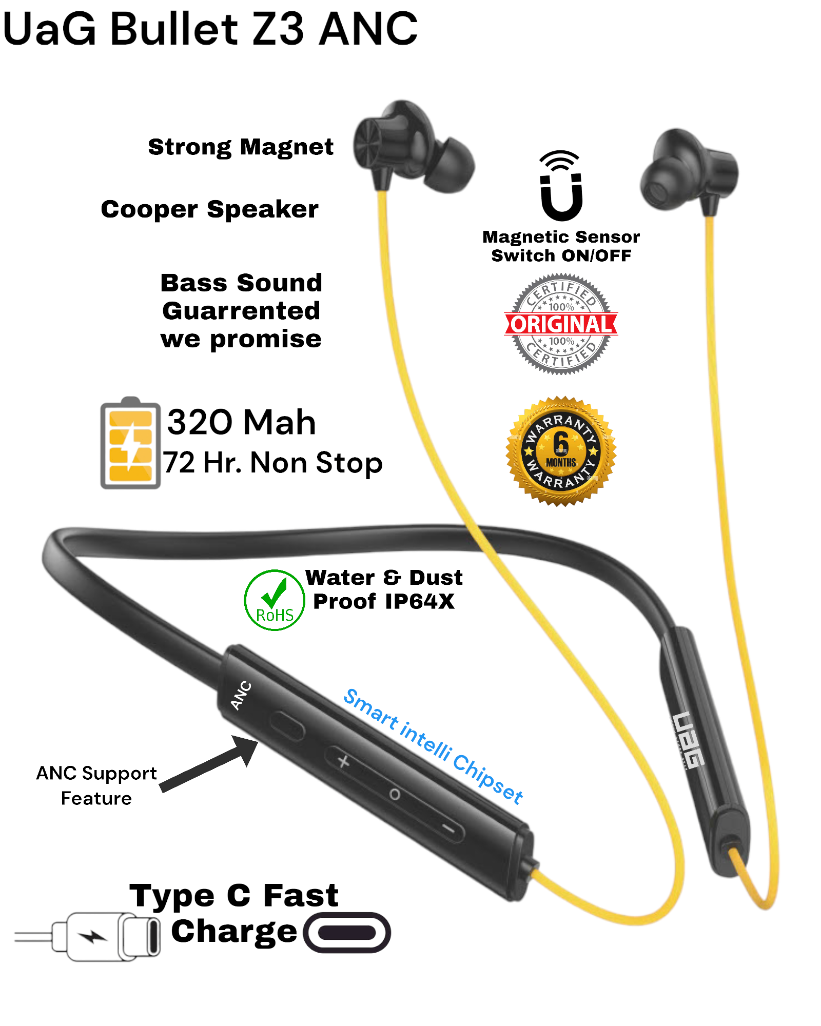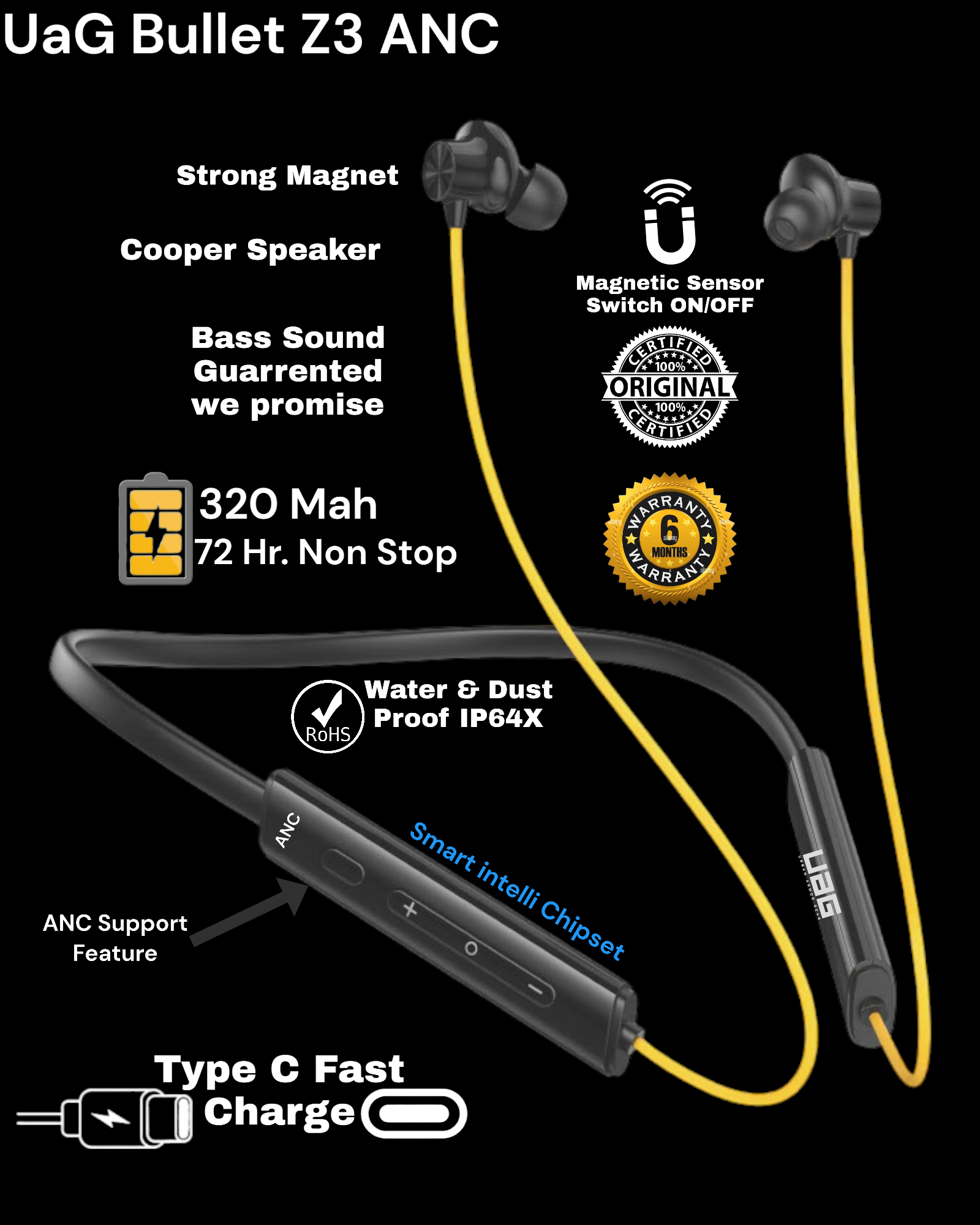 UAG Urbn Armour Gear Bullet z3 ANC Magnetic Sensor ON OFF Blutooth Neckband which comes with 50 hour Battery Backup and high Quality Design with Deep Bass sound with Gaming Chipset With cooper speaker and matel Ears or Type C fast charge or Vibration on calls and notifications Feature and Water or Dust proof