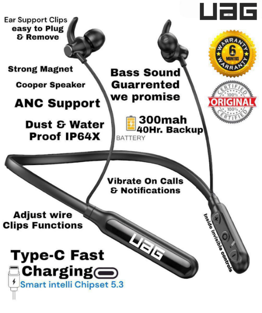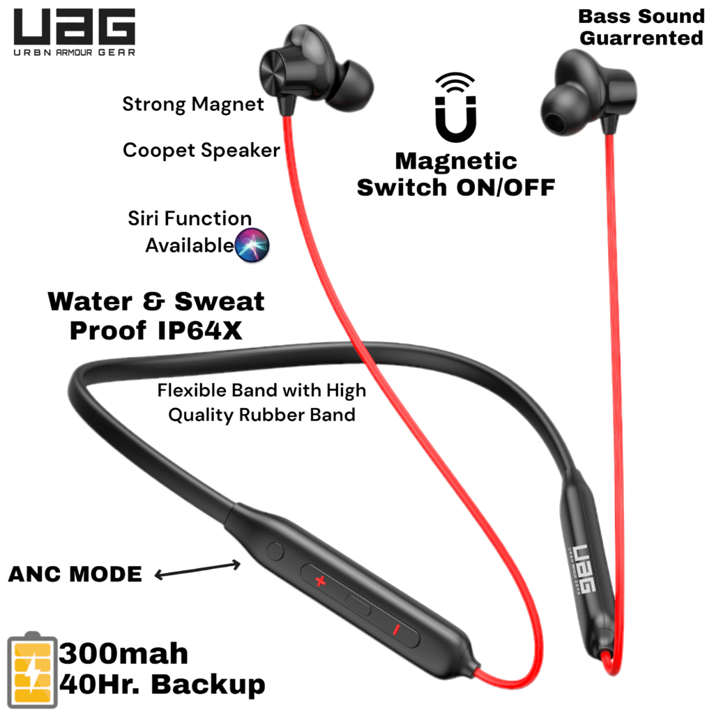 UAG urbn armour gear Transparent ANC Magnetic Neckband which comes with 40 hour Battery Backup and high Quality Design with Deep Bass sound with Gaming Chipset With cooper speaker and matel Ears or Type C fast charge or Vibration on calls and notifications Feature and Water or Dust proof