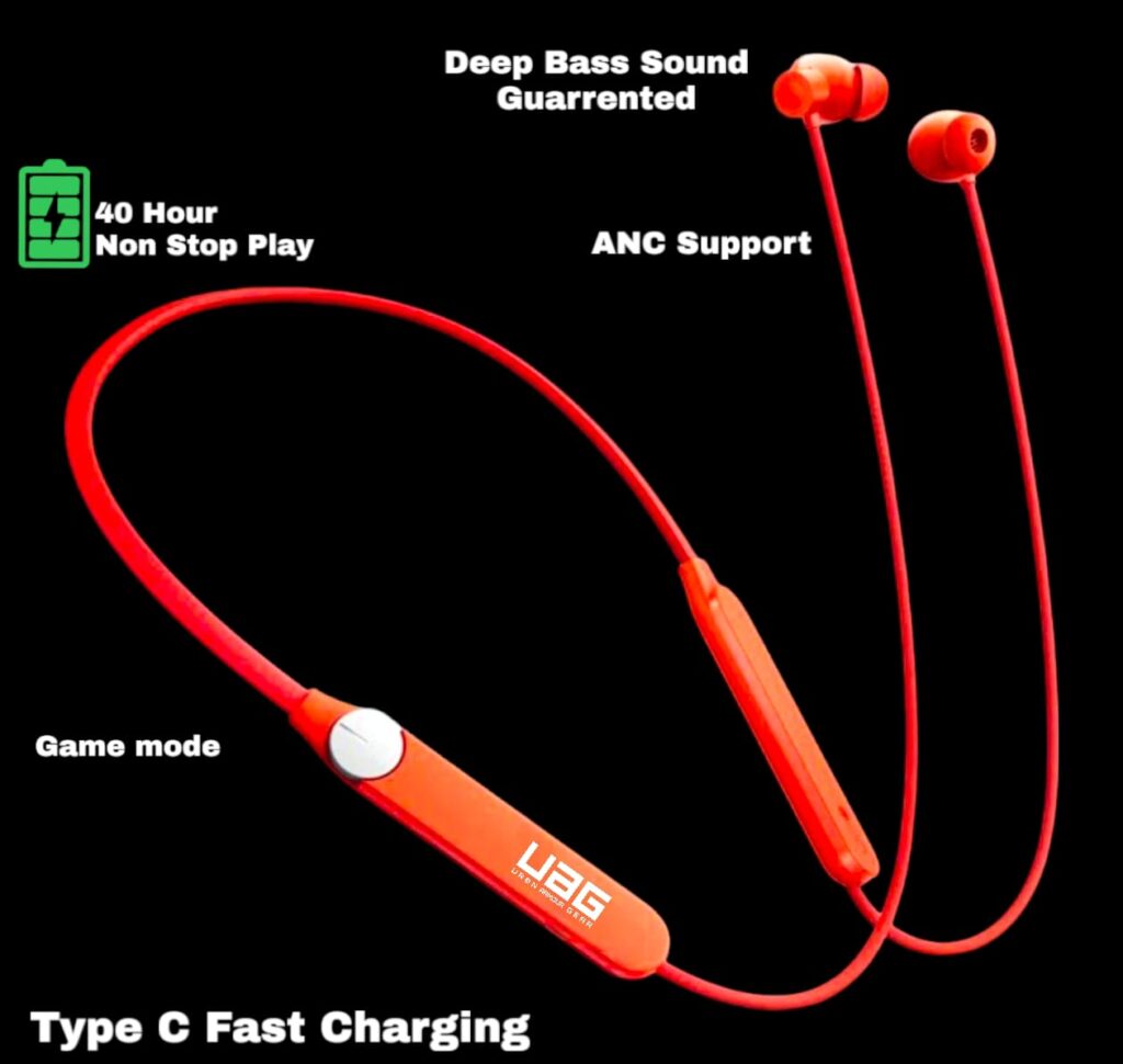 UAG Urbn Armour Gear ANC Gaming&Music Magnetic Sensor Neckband comes with Deep Bass sound with 40hour battery backup Classic Nackband with sweat and water proof OR comes with fully flexible wire Bluetooth neckband refers to a type of wearable device designed to rest comfortably around your neck, typically with earbuds or headphones attached via wires or as part of the band itself. These devices use Bluetooth technology to wirelessly connect to your smartphone, tablet, or other compatible devices, allowing you to listen to music, make phone calls, or engage in other audio activities without the need for wired connections. Bluetooth neckbands are popular because they offer several advantages: Convenience: They are easy to wear around your neck and often come with magnetic earbuds that can be attached to the neckband when not in use. Battery Life: Many Bluetooth neckbands have a longer battery life compared to truly wireless earbuds, as they can accommodate larger batteries due to their design. Call and Music Controls: They typically feature built-in controls for adjusting volume, skipping tracks, and answering calls directly from the neckband. Comfort: The design allows for even weight distribution around the neck, making them comfortable for extended wear. Versatility: Some models also include features like vibration alerts for incoming calls, multipoint connectivity (connecting to multiple devices simultaneously), and water resistance.