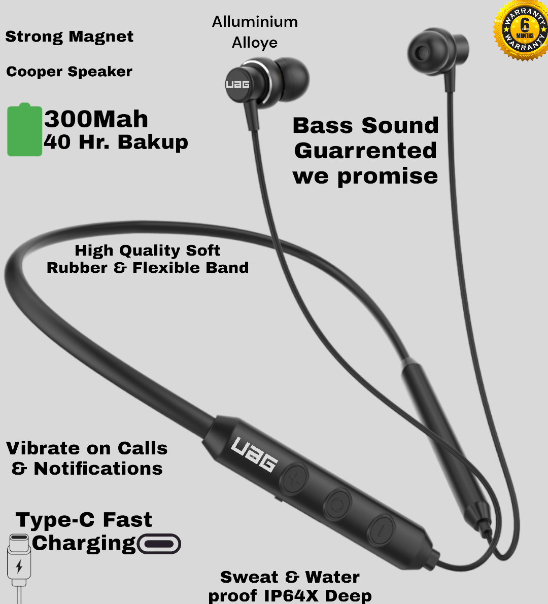 UAG Urbn Armour Gear Luxury Matt Black colour comes with vibrator and Deep Bass sound with 40hour battery backup Classic Nackband with sweat and water proof OR comes with fully flexible wire Bluetooth neckband refers to a type of wearable device designed to rest comfortably around your neck, typically with earbuds or headphones attached via wires or as part of the band itself. These devices use Bluetooth technology to wirelessly connect to your smartphone, tablet, or other compatible devices, allowing you to listen to music, make phone calls, or engage in other audio activities without the need for wired connections. Bluetooth neckbands are popular because they offer several advantages: Convenience: They are easy to wear around your neck and often come with magnetic earbuds that can be attached to the neckband when not in use. Battery Life: Many Bluetooth neckbands have a longer battery life compared to truly wireless earbuds, as they can accommodate larger batteries due to their design. Call and Music Controls: They typically feature built-in controls for adjusting volume, skipping tracks, and answering calls directly from the neckband. Comfort: The design allows for even weight distribution around the neck, making them comfortable for extended wear. Versatility: Some models also include features like vibration alerts for incoming calls, multipoint connectivity (connecting to multiple devices simultaneously), and water resistance.